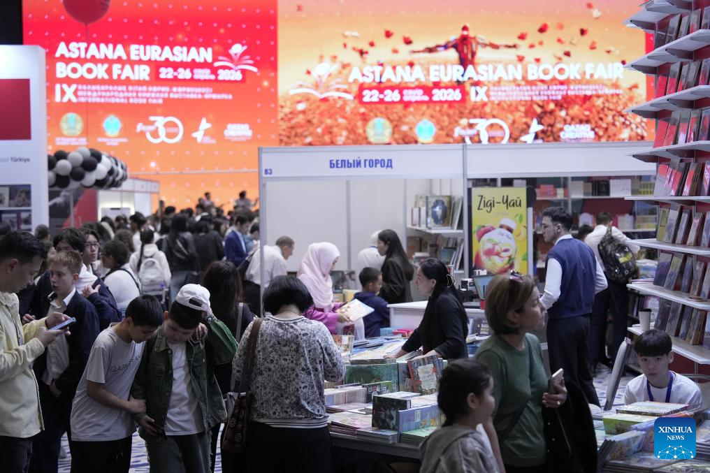 People visit the Eurasian Book Fair in Astana, Kazakhstan, April 22, 2026. This event is held here from April 22 to 26. (Photo by Kalizhan Ospanov/Xinhua)
