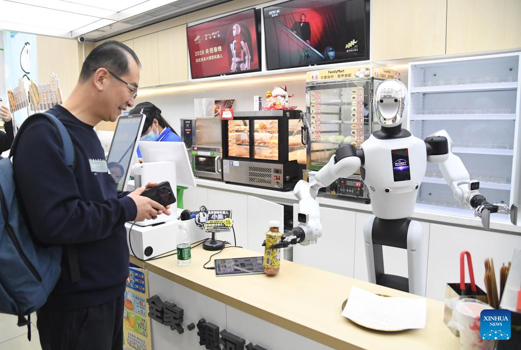 A humanoid robot passes a bottle of beverage to a customer at a convenience store in Haidian District of Beijing, capital of China, April 22, 2026. An embodied large model robot has recently been deployed in a convenience store in Haidian District to provide regular service. The robot is responsible for greeting customers, answering product inquiries, providing promotion information, and delivering goods. (Xinhua/Ren Chao)
