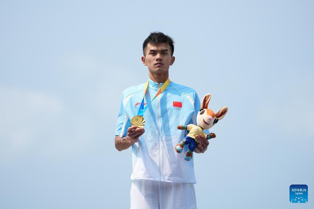 Gold medalist Fan Junjie of China poses for photos during the awarding ceremony of the men's individual of aquathlon event at the 6th Asian Beach Games in Sanya, south China's Hainan Province, April 23, 2026. (Xinhua/Pan Yulong)