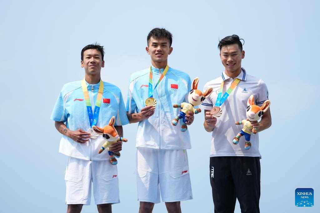 Gold medalist Fan Junjie (C) of China, silver medalist Teng Yunfeng (L) of China and bronze medalist Pan Tzu-I of Chinese Taipei pose for photos during the awarding ceremony of the men's individual of aquathlon event at the 6th Asian Beach Games in Sanya, south China's Hainan Province, April 23, 2026. (Xinhua/Pan Yulong)