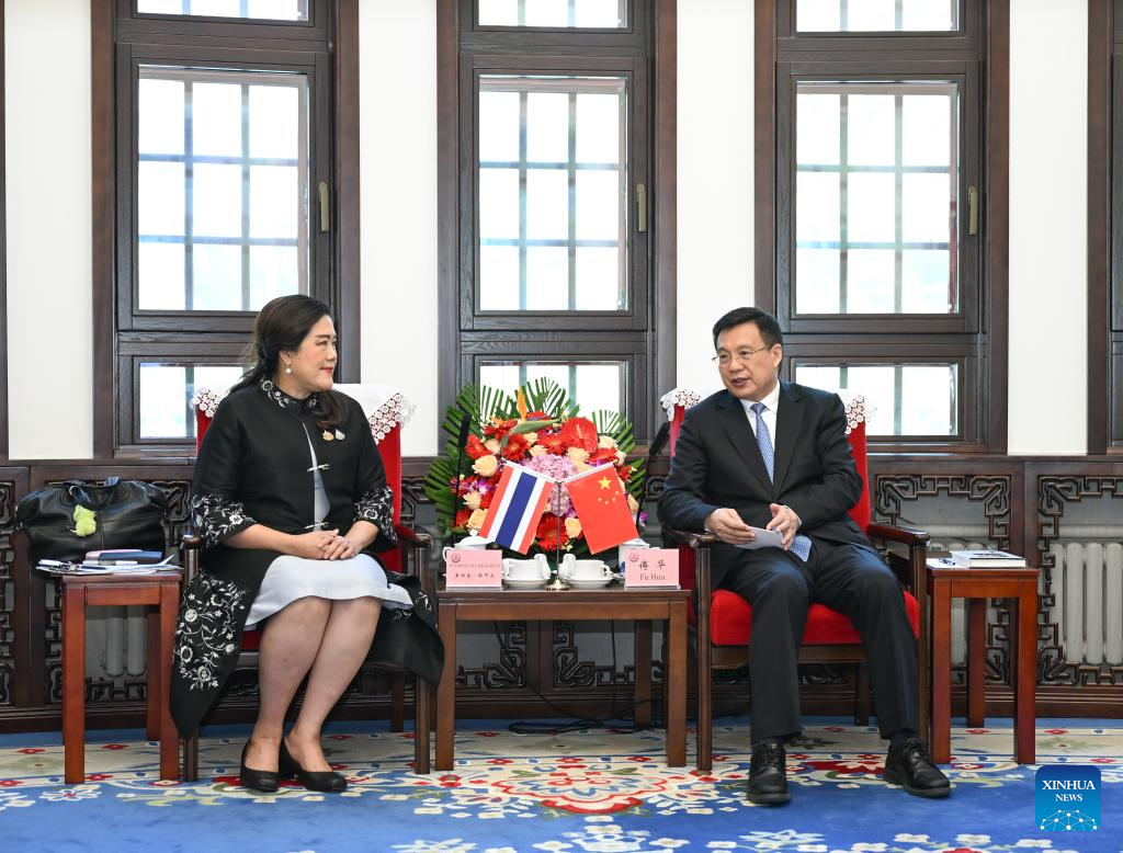 President of Xinhua News Agency Fu Hua meets with Sudruetai Lertkasem, director-general of the Public Relations Department of the Kingdom of Thailand, in Beijing, capital of China, April 23, 2026. (Xinhua/Li Xiang)