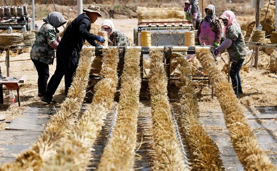 BEIJING, April 22 (Xinhua) -- Along the southeastern edge of China's Tengger Desert, workers were pressing bundles of straw rope into the sand in a grid pattern, like a giant checkerboard holding the dunes in place.