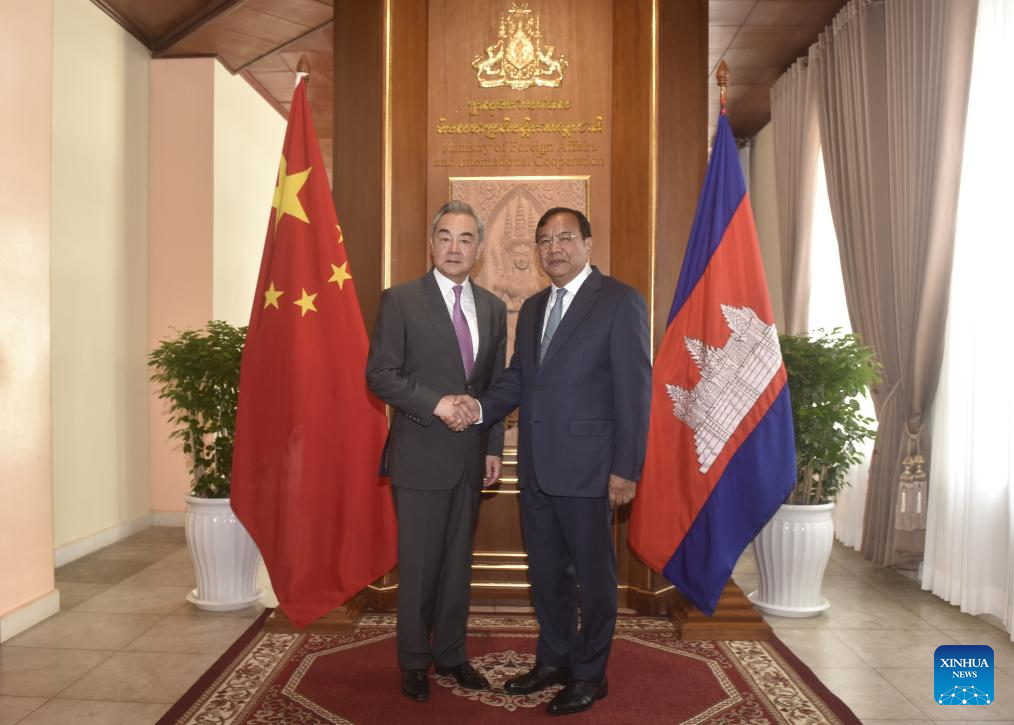 PHNOM PENH, April 23 (Xinhua) -- Wang Yi, a member of the Political Bureau of the Communist Party of China Central Committee and foreign minister, held talks with Cambodian Deputy Prime Minister and Minister of Foreign Affairs and International Cooperation Prak Sokhonn here on Thursday.