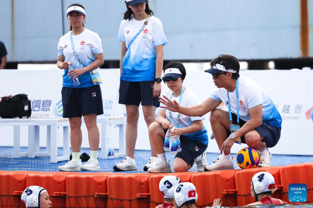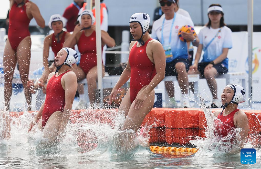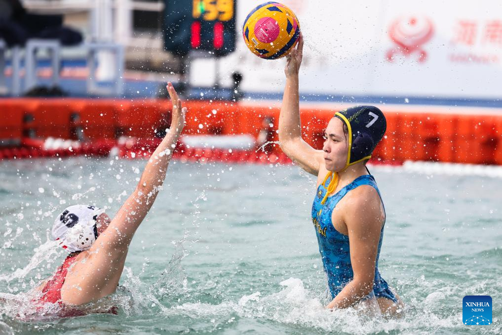 Ng Hau Laam Fran (R) of China's Hong Kong competes during the water polo women's round-robin final match between China's Hong Kong and Kazakhstan at the 6th Asian Beach Games in Sanya, south China's Hainan Province, April 23, 2026. (Xinhua/Zhu Weixi)