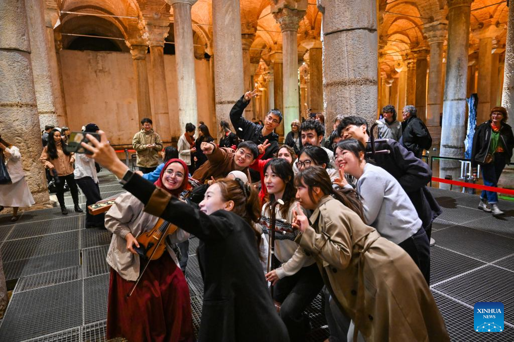Visitors take photos of a flash mob performance of Chinese folk music at Basilica Cistern in Istanbul, Türkiye, April 22, 2026. Nanjing University's traditional instrument orchestra, in collaboration with the Confucius Institute at Bogazici University, staged a flash mob performance of Chinese folk music here on Wednesday, attracting many visitors. (Xinhua/Liu Lei)