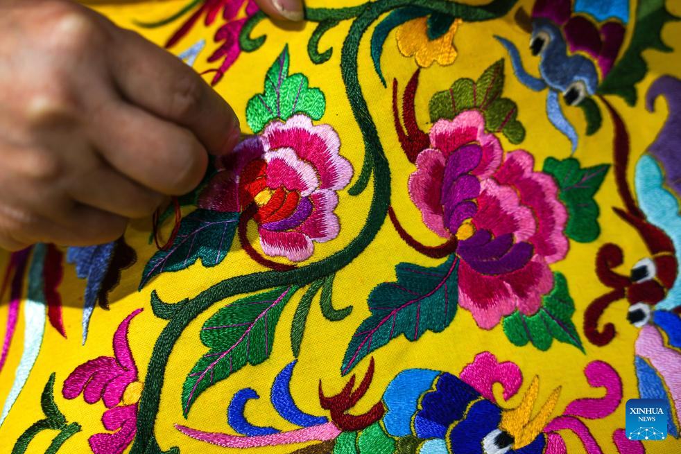A villager works on an embroidery work in Zhaoxing Dong Village of Liping County, southwest China's Guizhou Province, April 21, 2026.