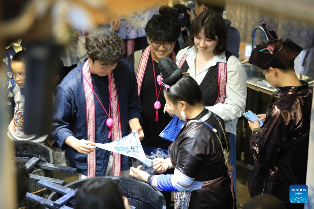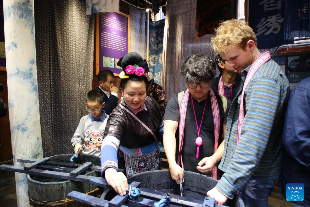 Foreign tourists try indigo dyeing in Zhaoxing Dong Village of Liping County, southwest China's Guizhou Province, March 23, 2026.