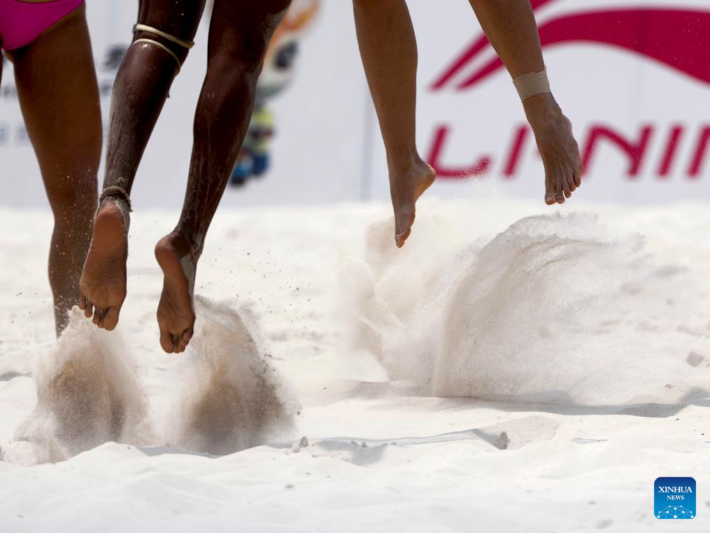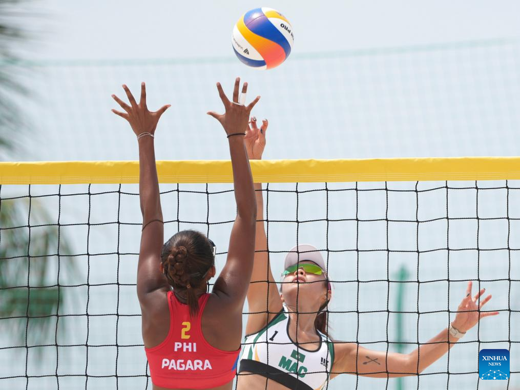 Players of both teams compete during the beach volleyball women's preliminary pool G match between Khylem Harl Progella/Sofiah Shanine Pagara of the Philippines and Leong On Ieng/Law Weng Sam of China's Macao at the 6th Asian Beach Games in Sanya, south China's Hainan Province, April 23, 2026. (Xinhua/Xu Bingjie)