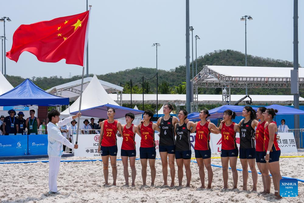 Players of China sing the national anthem before the beach handball women's preliminary round group B match between China and Mongolia at the 6th Asian Beach Games in Sanya, south China's Hainan Province, April 23, 2026. (Xinhua/Li Bo)