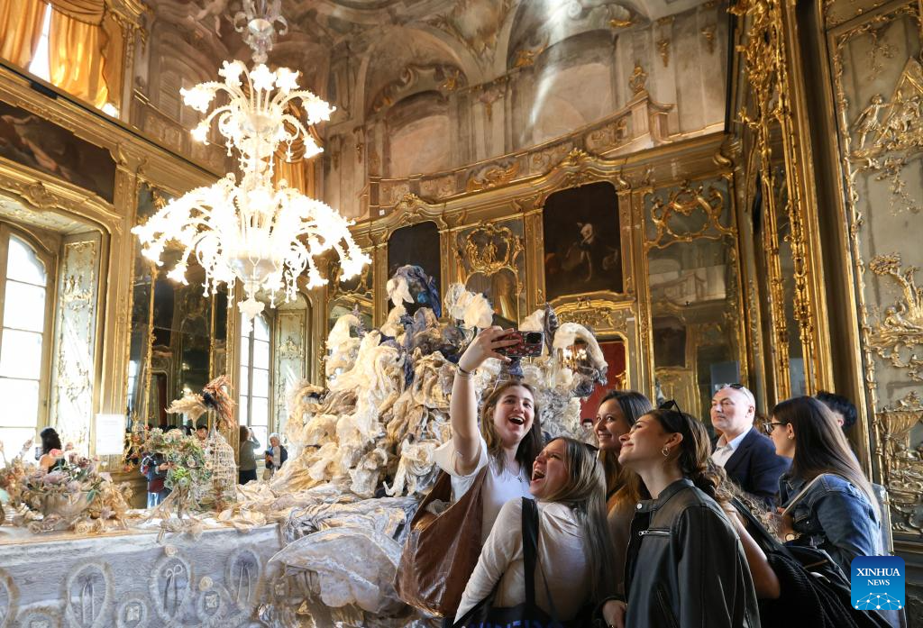 Visitors pose for a selfie with exhibits during Milan Design Week at Plazzo Litta in Milan, Italy, April 23, 2026. (Xinhua/Li Jing)