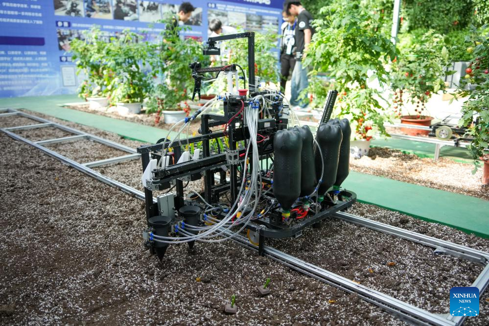A seedling planting robot is seen at the 27th China (Shouguang) International Vegetable Science and Technology Expo in Shouguang, east China's Shandong Province, April 20, 2026. Featuring more than 50 types of agricultural robots in its booth for digital agriculture, this year's expo allow visitors to peep into the future of unmanned farming. (Xinhua/Xu Suhui)