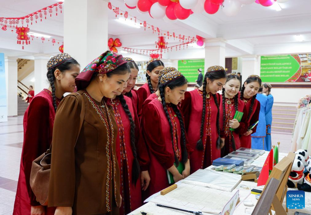 A teacher and students attend the 2026 International Chinese Language Day event in Ashgabat, Turkmenistan, April 23, 2026. A celebration event marking the 2026 International Chinese Language Day was held here Thursday. (Photo by Cui Jiaxin/Xinhua)
