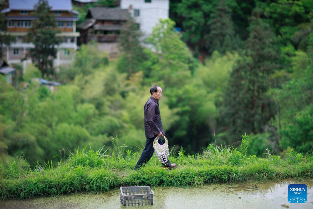 A silversmith carrying a silver ornament is pictured in Shuikou Township of Liping County, southwest China's Guizhou Province, April 21, 2026.