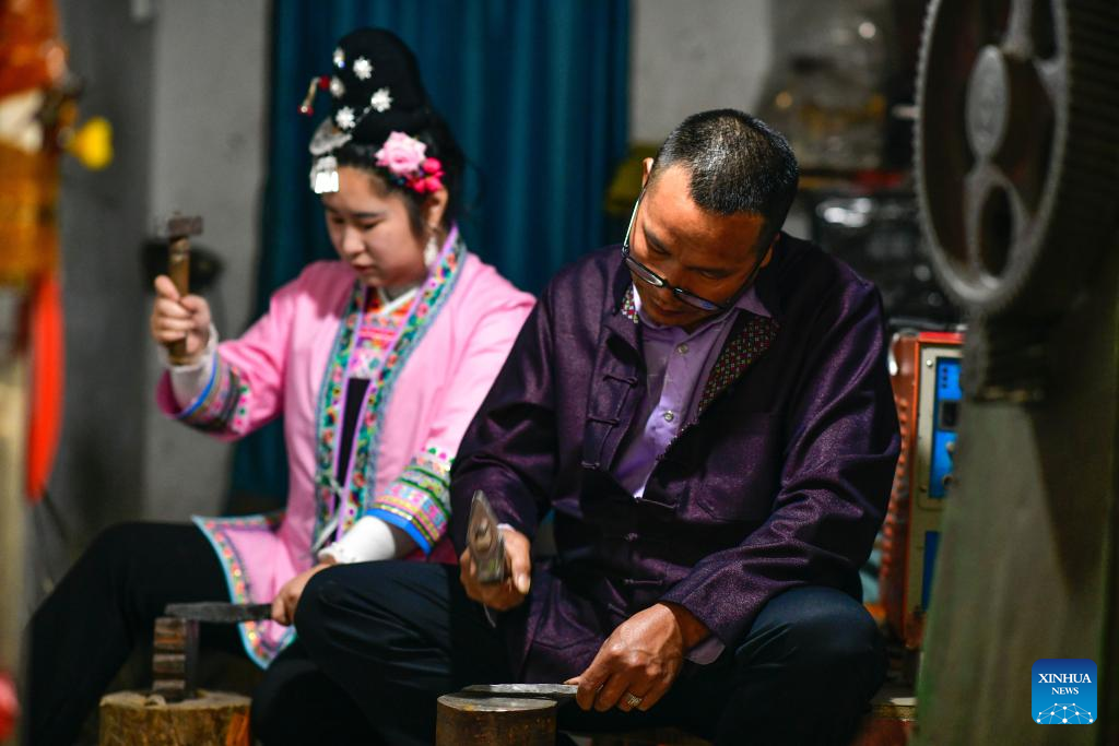 A silversmith (R) and his daughter work on silver ornaments in Shuikou Township of Liping County, southwest China's Guizhou Province, April 21, 2026.