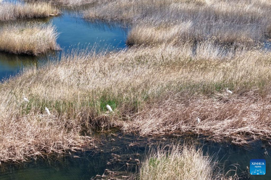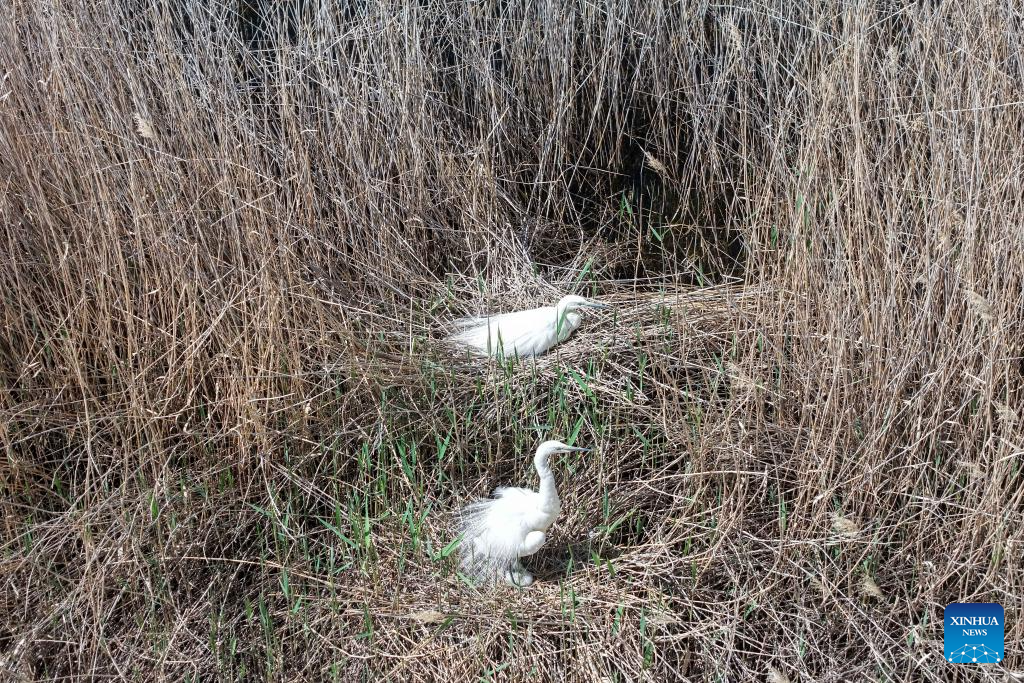 A drone photo taken on April 24, 2026 shows great egrets perching in the reeds in the Qingtu Lake in Minqin County, northwest China's Gansu Province. As the temperature rises, various birds inhabiting in the Qingtu Lake have gradually entered the breeding season. (Xinhua/Lang Bingbing)