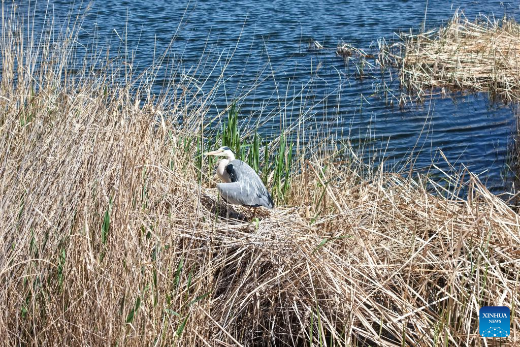 A drone photo taken on April 24, 2026 shows a grey heron and its chicks perching in the reeds in the Qingtu Lake in Minqin County, northwest China's Gansu Province. As the temperature rises, various birds inhabiting in the Qingtu Lake have gradually entered the breeding season. (Xinhua/Lang Bingbing)