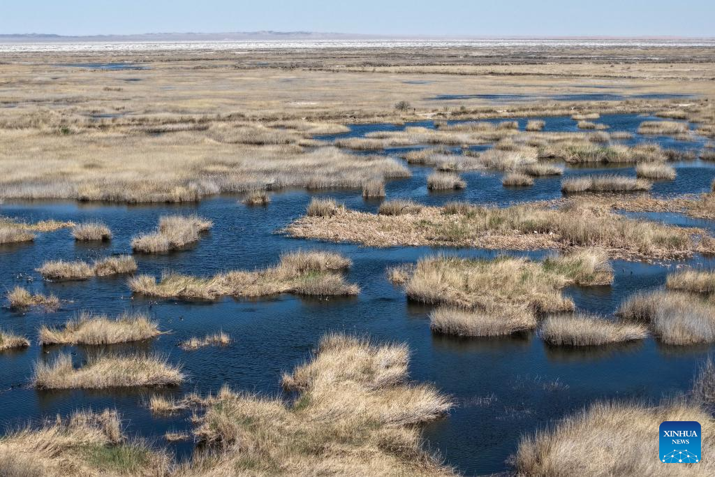 A drone photo taken on April 24, 2026 shows a view of the Qingtu Lake in Minqin County, northwest China's Gansu Province. As the temperature rises, various birds inhabiting in the Qingtu Lake have gradually entered the breeding season. (Xinhua/Lang Bingbing)
