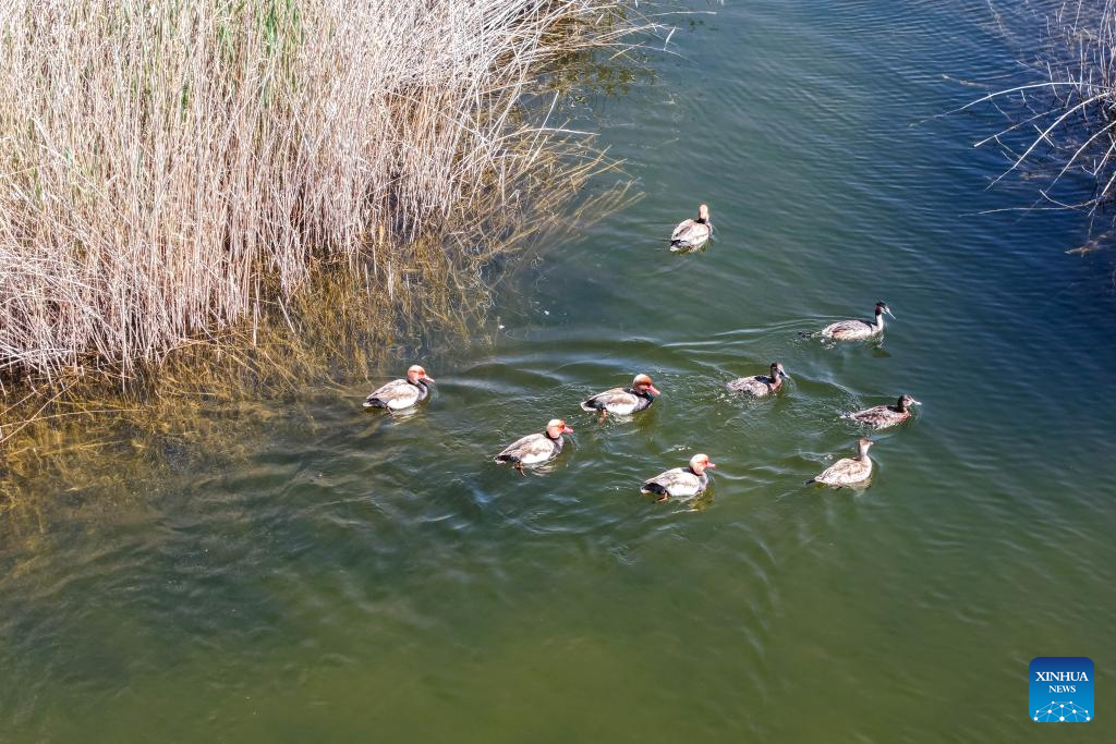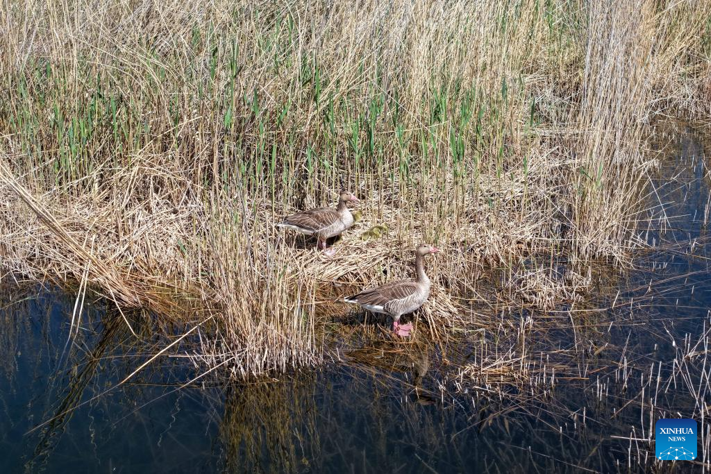 A drone photo taken on April 24, 2026 shows greylag geese perching in the reeds in the Qingtu Lake in Minqin County, northwest China's Gansu Province. As the temperature rises, various birds inhabiting in the Qingtu Lake have gradually entered the breeding season. (Xinhua/Lang Bingbing)