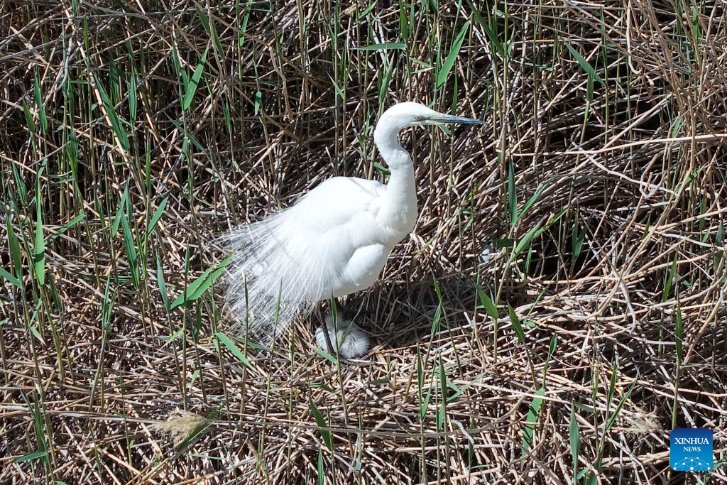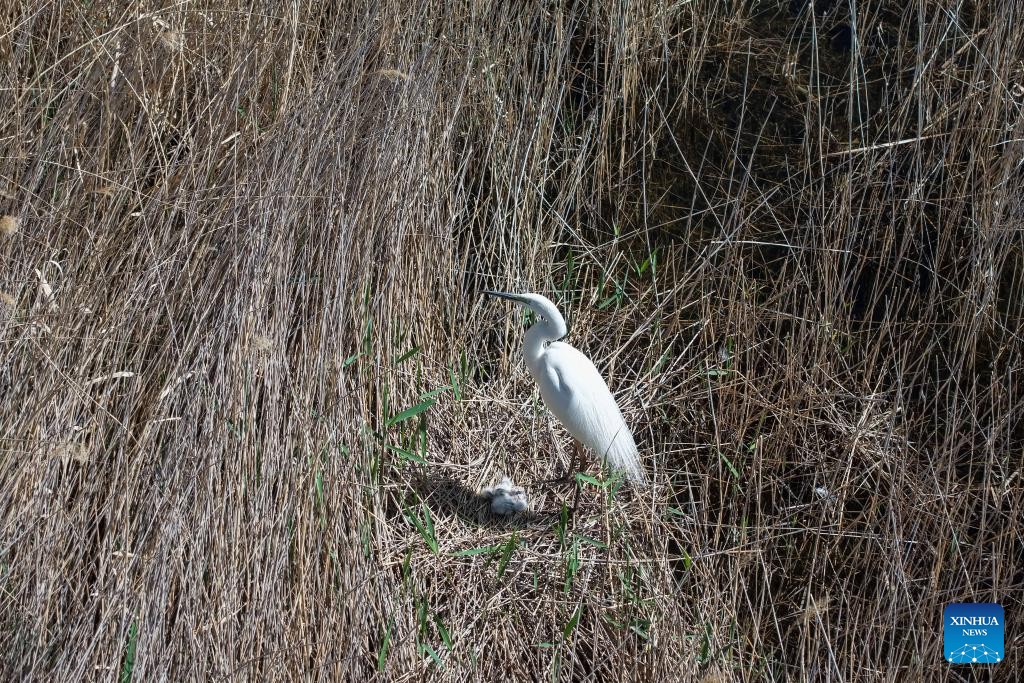 A drone photo taken on April 24, 2026 shows a great egret and its chicks perching in the reeds in the Qingtu Lake in Minqin County, northwest China's Gansu Province. As the temperature rises, various birds inhabiting in the Qingtu Lake have gradually entered the breeding season. (Xinhua/Lang Bingbing)