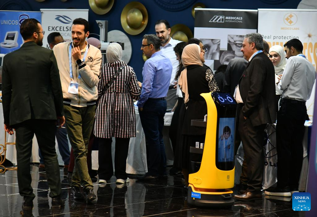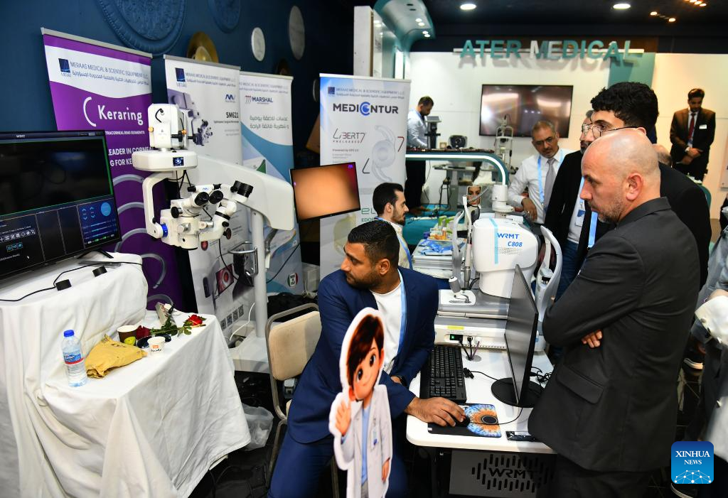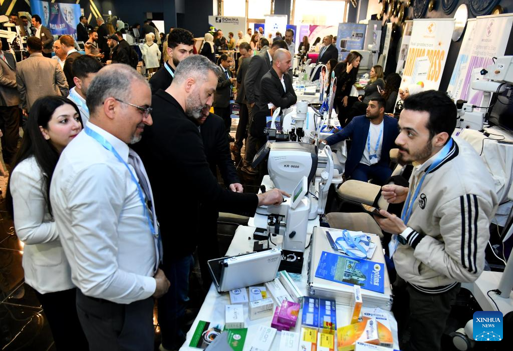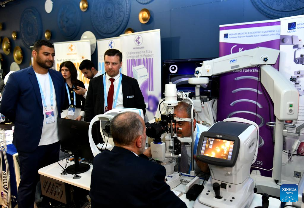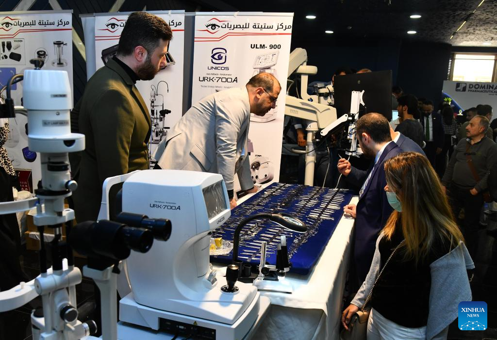 People attend an ophthalmology equipment fair in Damascus, Syria, April 23, 2026. The event brings together participants from Syria and neighboring Arab countries to showcase the latest medical technologies and developments in eye care. (Photo by Ammar Safarjalani/Xinhua)