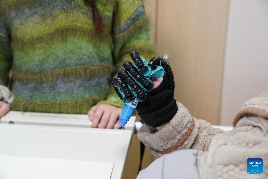 Mr. Deng controls an exoskeleton via brain-computer interface to hold a pen and paint, in Nanchang, east China's Jiangxi Province, March 28, 2026. Recently, a neurosurgery team at the First Affiliated Hospital of Nanchang University successfully performed a clinical operation of the fully implantable, fully wireless, fully functional ("Triple-F") brain-computer interface (BCI) system.