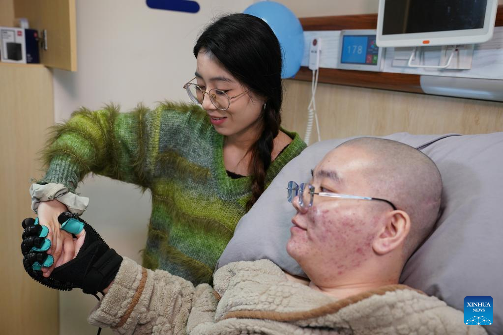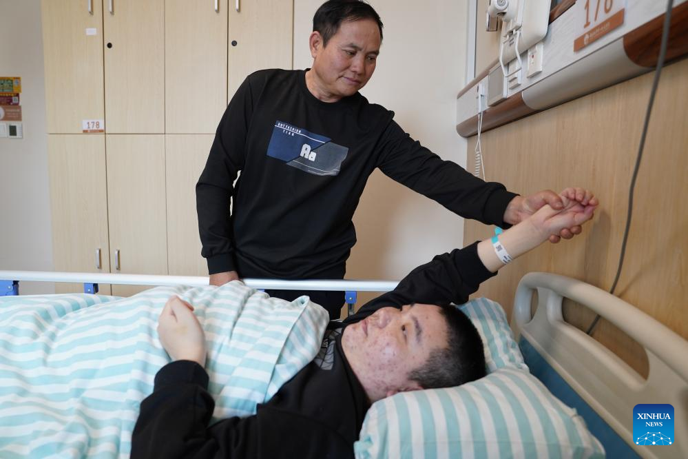 Mr. Deng's family member assists him in moving his arm before undergoing brain-computer interface surgery, in Nanchang, east China's Jiangxi Province, Dec. 15, 2025. Recently, a neurosurgery team at the First Affiliated Hospital of Nanchang University successfully performed a clinical operation of the fully implantable, fully wireless, fully functional ("Triple-F") brain-computer interface (BCI) system.
