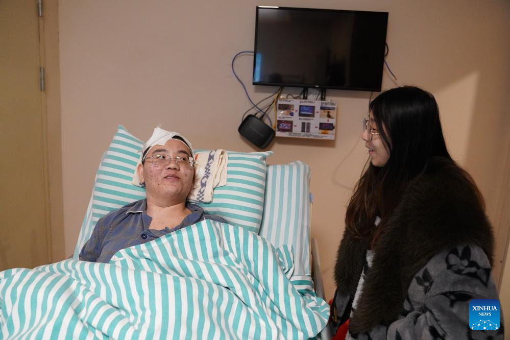 Mr. Deng talks with his wife during the postoperative recovery phase in Nanchang, east China's Jiangxi Province, Jan. 5, 2026. Recently, a neurosurgery team at the First Affiliated Hospital of Nanchang University successfully performed a clinical operation of the fully implantable, fully wireless, fully functional ("Triple-F") brain-computer interface (BCI) system.