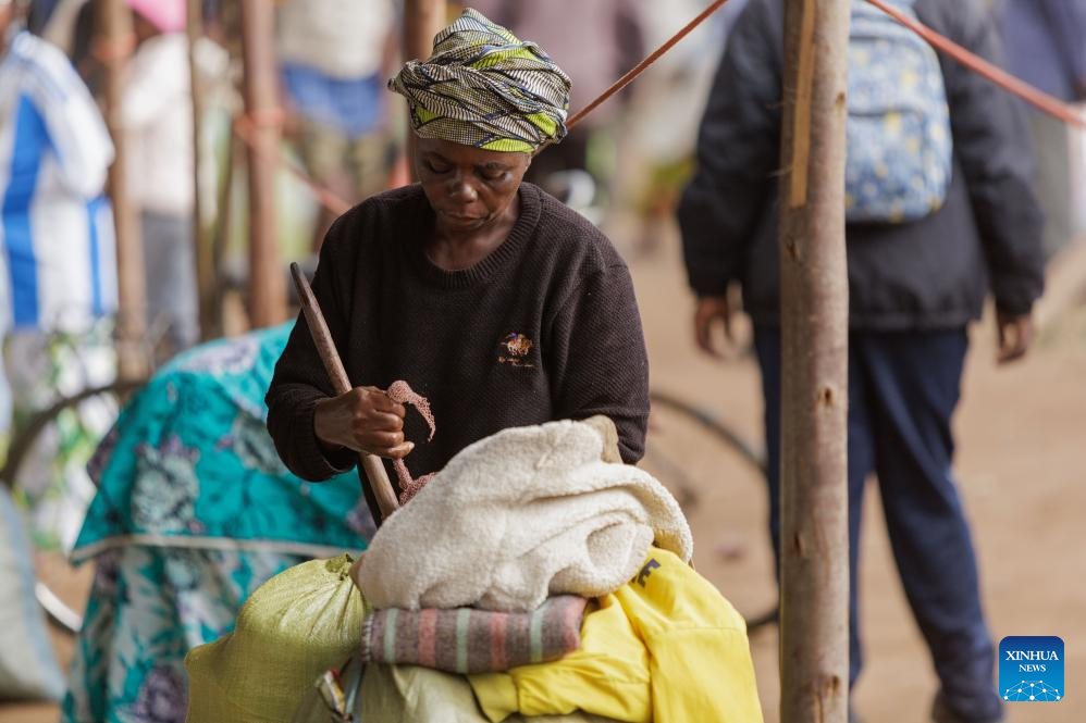 A woman checks her belongings in Uvira, Democratic Republic of the Congo (DRC), on April 23, 2026. The first group of roughly 470 Congolese refugees in Burundi began returning voluntarily to eastern Democratic Republic of the Congo on Thursday, the United Nations refugee agency said.