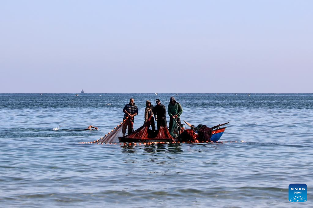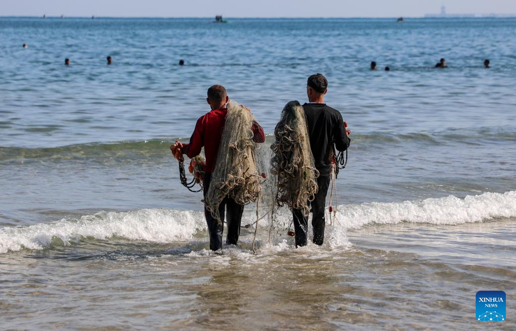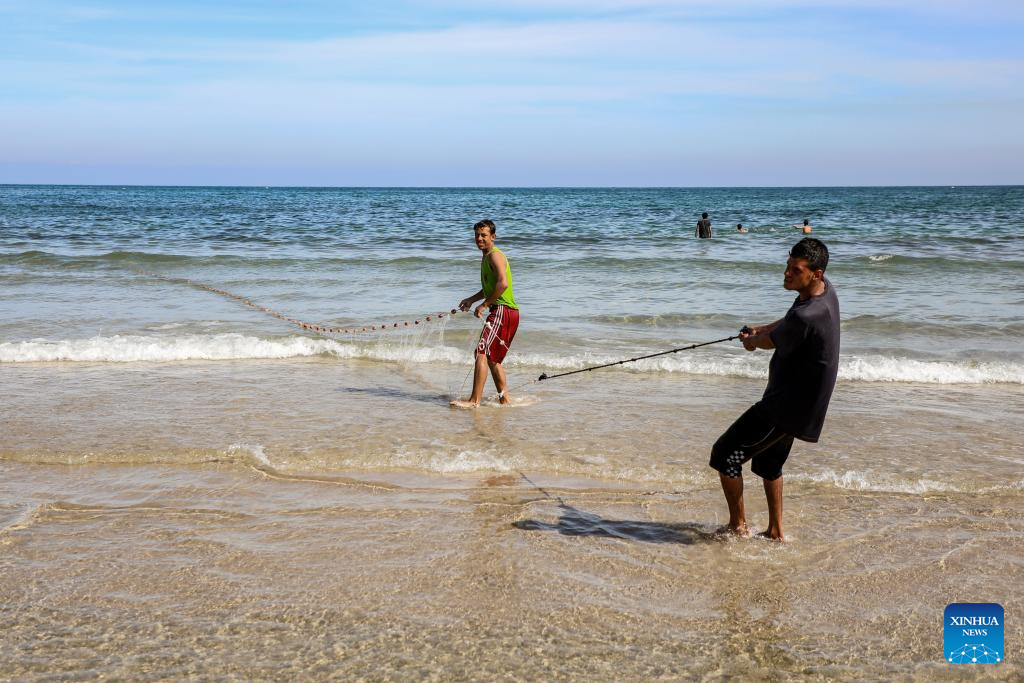 Palestinian fishermen are seen fishing on the beach in Gaza City, on April 24, 2026. (Photo by Rizek Abdeljawad/Xinhua)