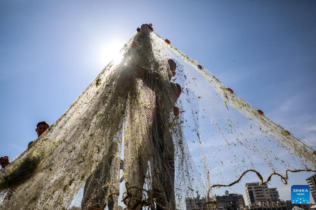 Palestinian fishermen are seen fishing on their boats near the Gaza port in Gaza City, on April 24, 2026. (Photo by Rizek Abdeljawad/Xinhua)