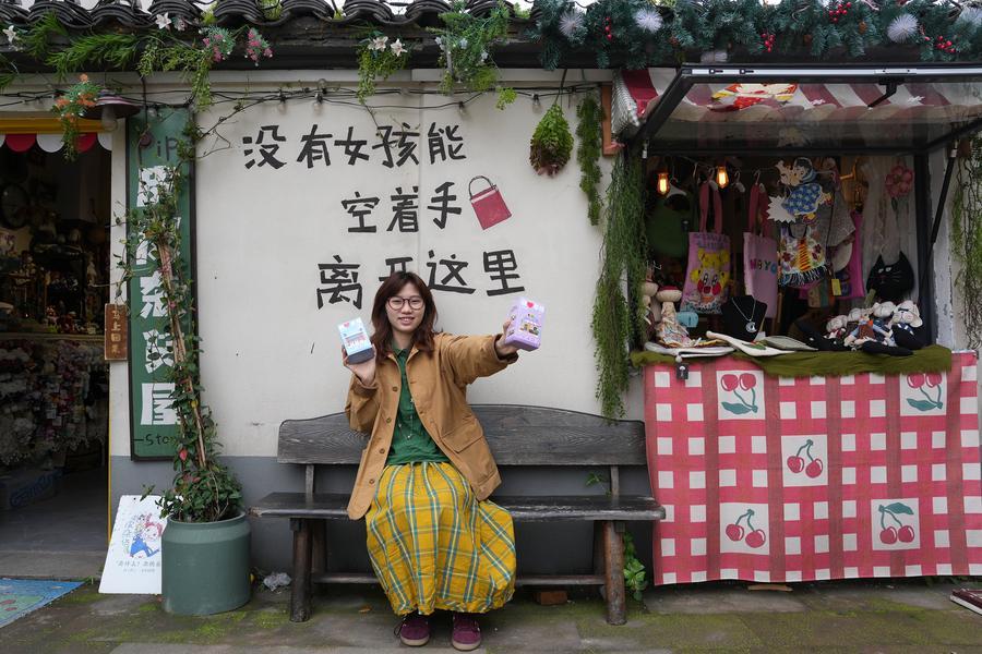Ye Lupin poses for a photo in front of the shop she operates in Lizu Village of Yiwu, east China's Zhejiang Province, March 31, 2026. (Xinhua/Huang Zongzhi)
