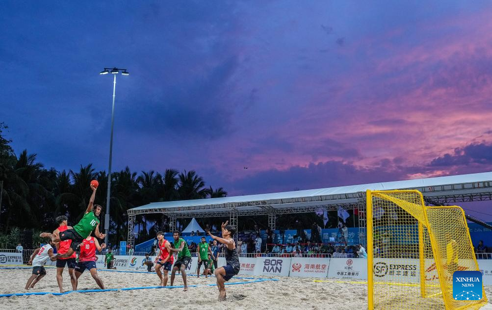 Fathuhulla Adam (top) of Maldives competes during the beach handball men's preliminary round group B match between Thailand and Maldives at the 6th Asian Beach Games in Sanya, south China's Hainan Province, April 24, 2026. (Xinhua/Li Bo)