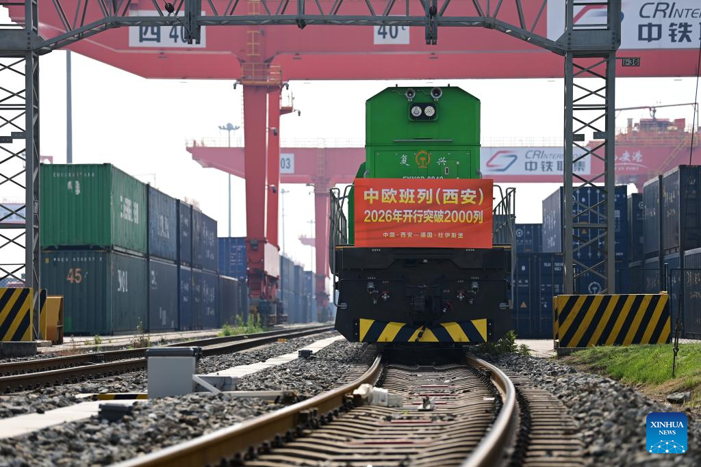 This photo taken on April 24, 2026 shows a China-Europe freight train departing from the Xi'an International Port Station in Xi'an, northwest China's Shaanxi Province. The Xi'an International Port Station has handled over 2,000 China-Europe freight train trips this year. The total freight volume transported has exceeded 2.1 million tonnes in this period. (Xinhua/Zou Jingyi)