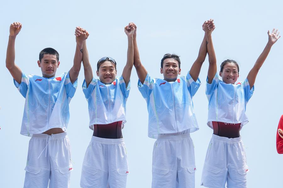 The Chinese quartet of Lin Xinyu, Teng Yunfei, Lu Meiyi and Luo Yunkang remained unfazed by the event's weather-related rescheduling, clocking one hour, one minute and 44 seconds to take the title. Hong Kong, China finished 51 seconds behind in second place, while Japan came third.
