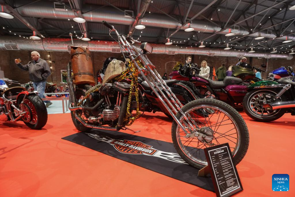 Motorcycles are displayed during the St. Petersburg Motorcycle Exhibition in St. Petersburg, Russia, on April 24, 2026. (Photo by Irina Motina/Xinhua)