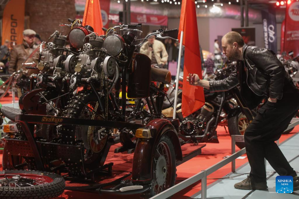A man cleans his motorcycle during the St. Petersburg Motorcycle Exhibition in St. Petersburg, Russia, on April 24, 2026. (Photo by Irina Motina/Xinhua)