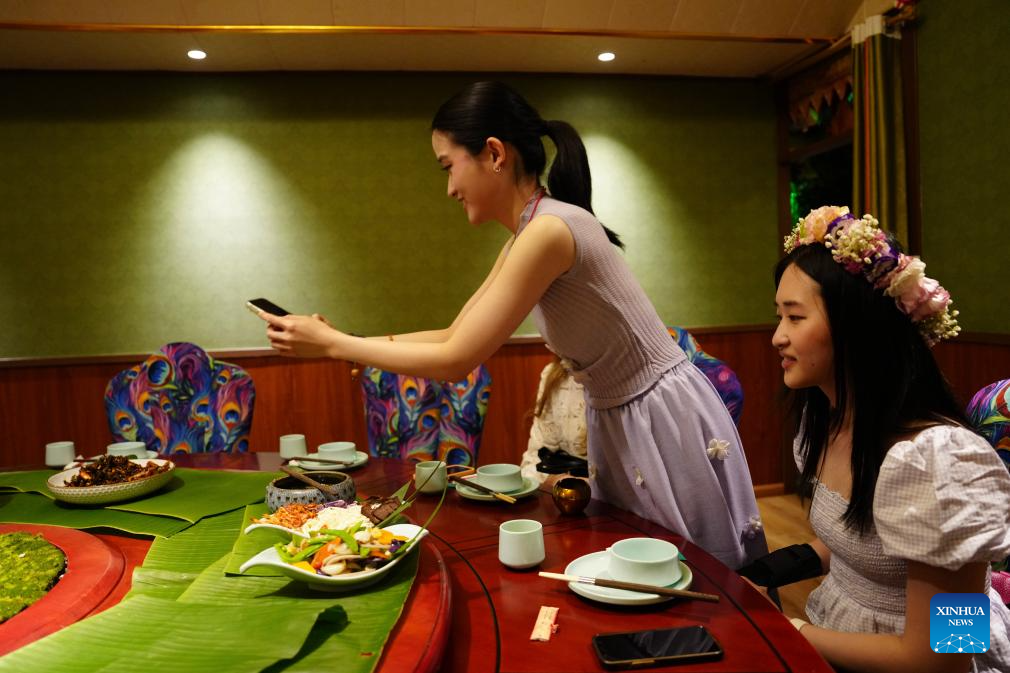 Chinese American Sherry Zhu (L) takes photos of "peacock banquet" at a restaurant in Kunming, southwest China's Yunnan Province, April 24, 2026. Chinese American Sherry Zhu, also a social media influencer who expected to explore China's Yunnan, had arrived Friday in Kunming for her TikTok series "Becoming Chinese".