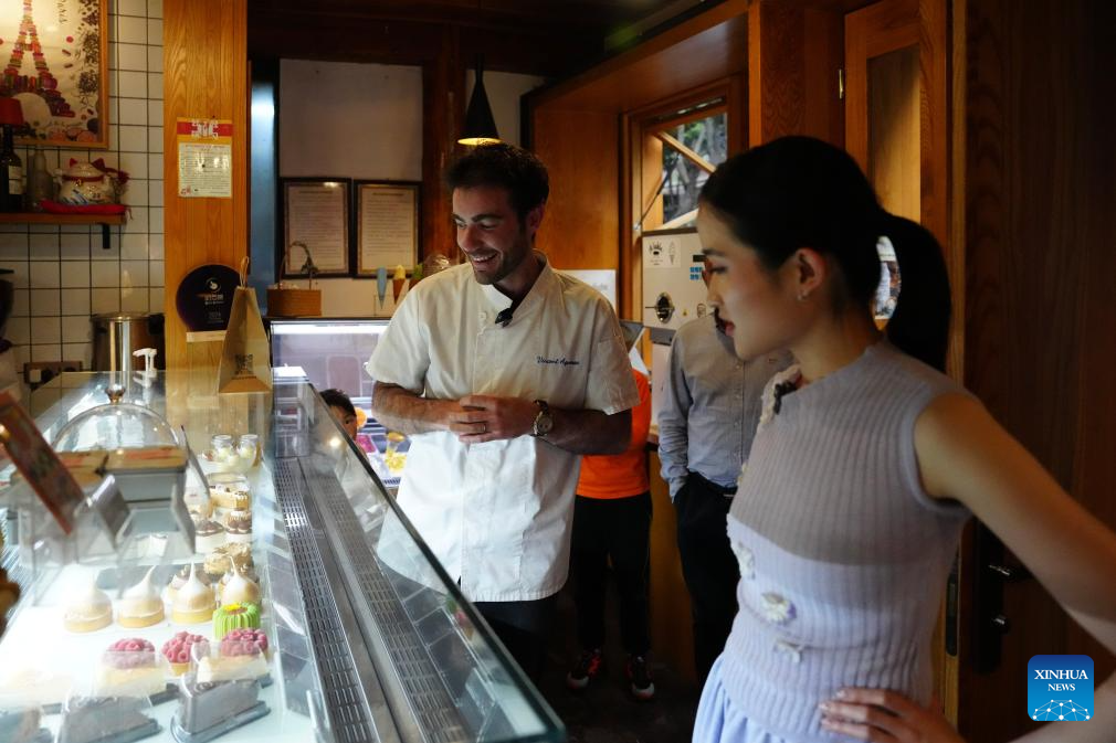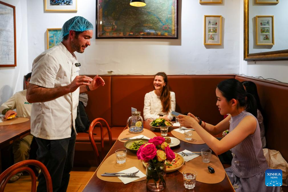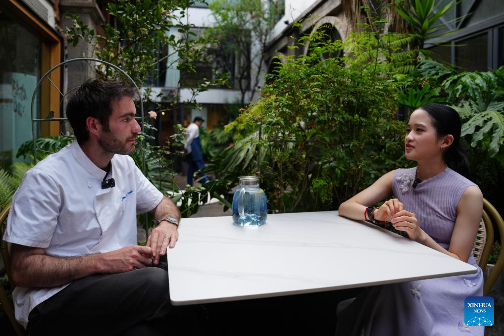 French chef Vincent introduces food to Chinese American Sherry Zhu (R) and her friends at his restaurant in Kunming, southwest China's Yunnan Province, April 24, 2026. (Xinhua/Chen Xinbo)