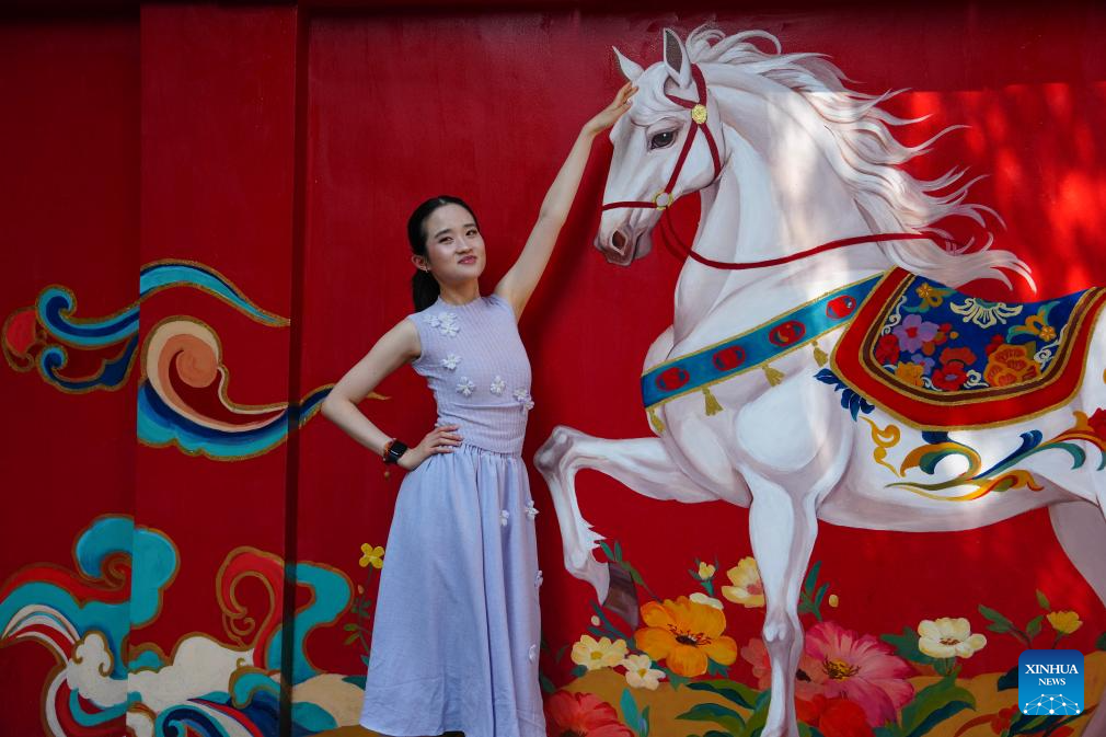 Chinese American Sherry Zhu poses for photos with a horse wall painting by Cuihu Lake in Kunming, southwest China's Yunnan Province, April 24, 2026. (Xinhua/Chen Xinbo)