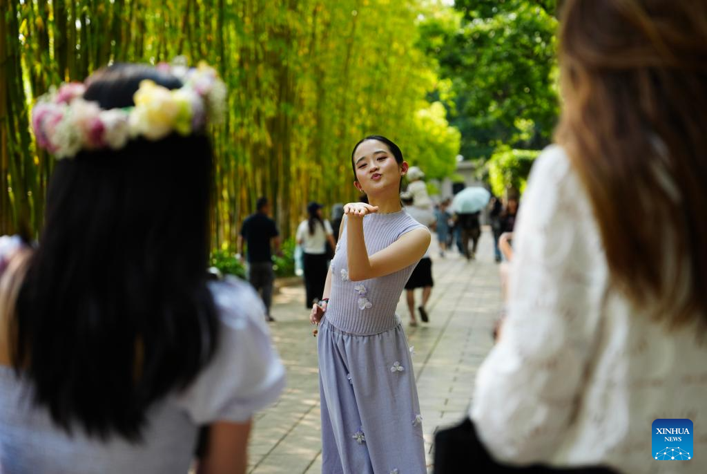 Chinese American Sherry Zhu poses for photos at Cuihu Lake park in Kunming, southwest China's Yunnan Province, April 24, 2026. (Xinhua/Chen Xinbo)
