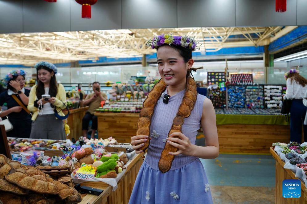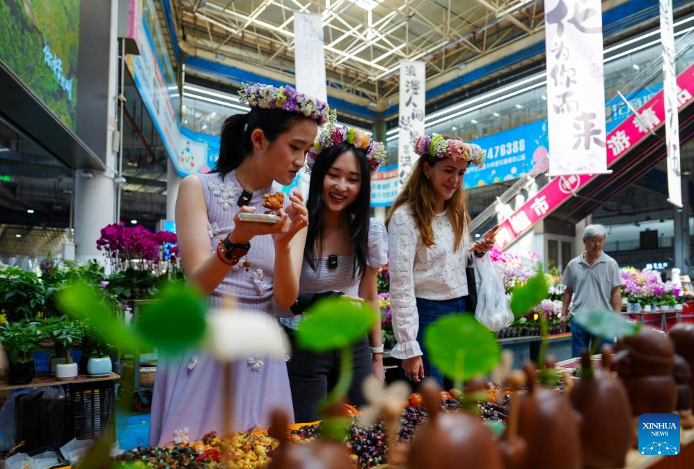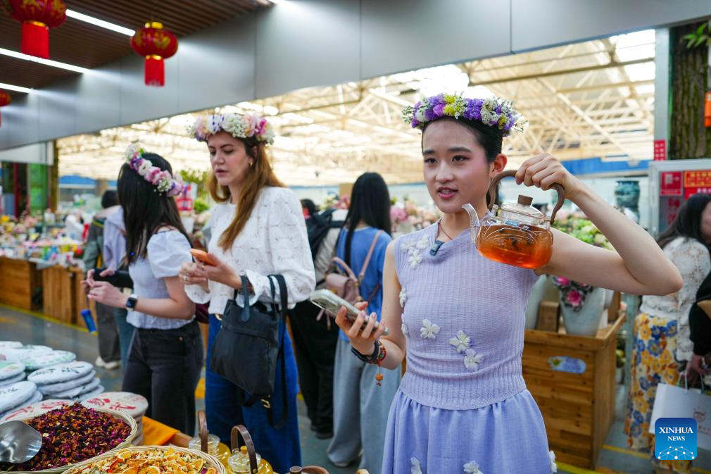 Chinese American Sherry Zhu visits a handiwork booth at Dounan Flower Market in Kunming, southwest China's Yunnan Province, April 24, 2026. (Xinhua/Chen Xinbo)