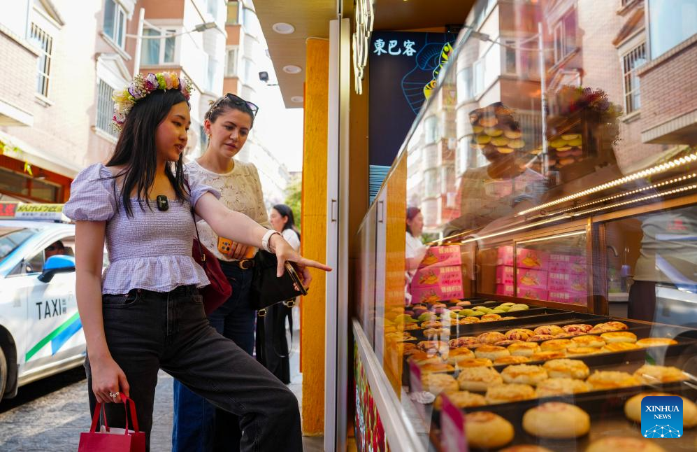 Chinese American Sherry Zhu's friends buy traditional flower cakes by Cuihu Lake in Kunming, southwest China's Yunnan Province, April 24, 2026. (Xinhua/Chen Xinbo)