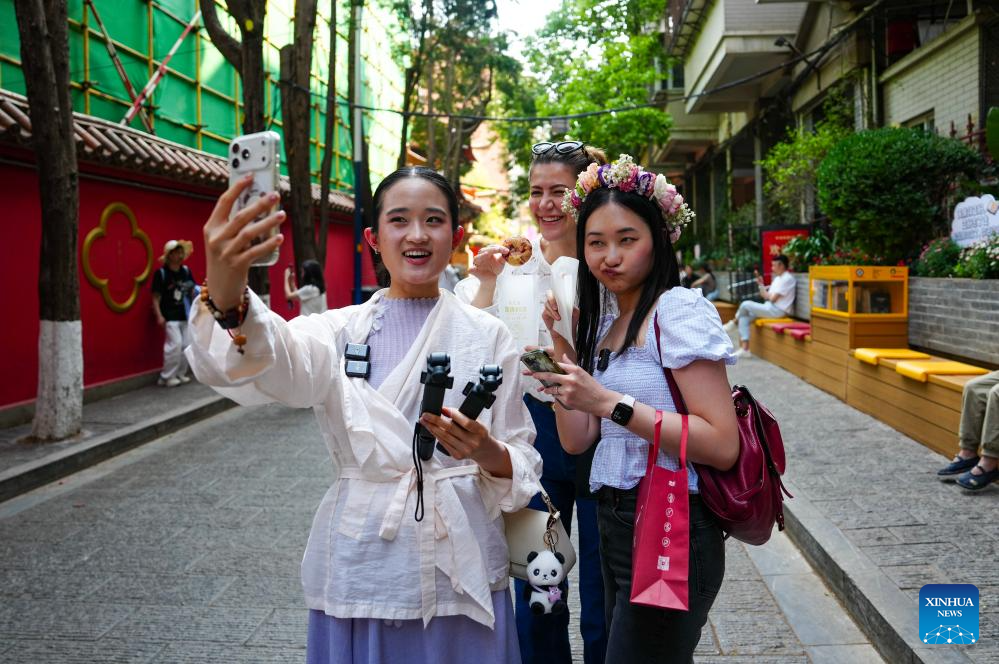 Chinese American Sherry Zhu (L) and her friends take selfie while tasting traditional flower cakes by Cuihu Lake in Kunming, southwest China's Yunnan Province, April 24, 2026. (Xinhua/Chen Xinbo)