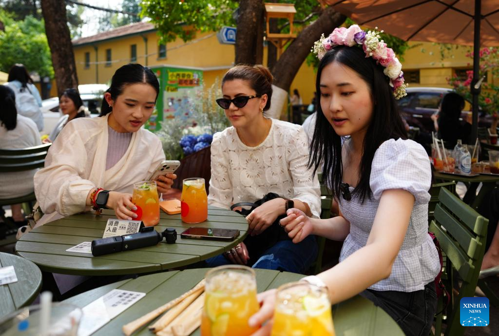 Chinese American Sherry Zhu (L) and her friends taste modern tea drinks by Cuihu Lake in Kunming, southwest China's Yunnan Province, April 24, 2026. (Xinhua/Chen Xinbo)