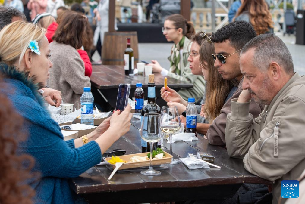 People relax and enjoy delicacies during the Jazz and Wine Festival at a seaside park in Baku, Azerbaijan, April 25, 2026. The ten-day event integrates Azerbaijan's indigenous wine-making traditions with musical art, bringing a relaxing and vibrant vibe to the city and drawing numerous locals and tourists for leisure and wine tasting. (Xinhua/Chen Junfeng)