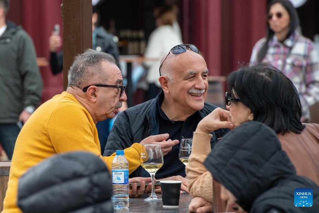People relax and taste wine during the Jazz and Wine Festival at a seaside park in Baku, Azerbaijan, April 25, 2026. The ten-day event integrates Azerbaijan's indigenous wine-making traditions with musical art, bringing a relaxing and vibrant vibe to the city and drawing numerous locals and tourists for leisure and wine tasting. (Xinhua/Chen Junfeng)