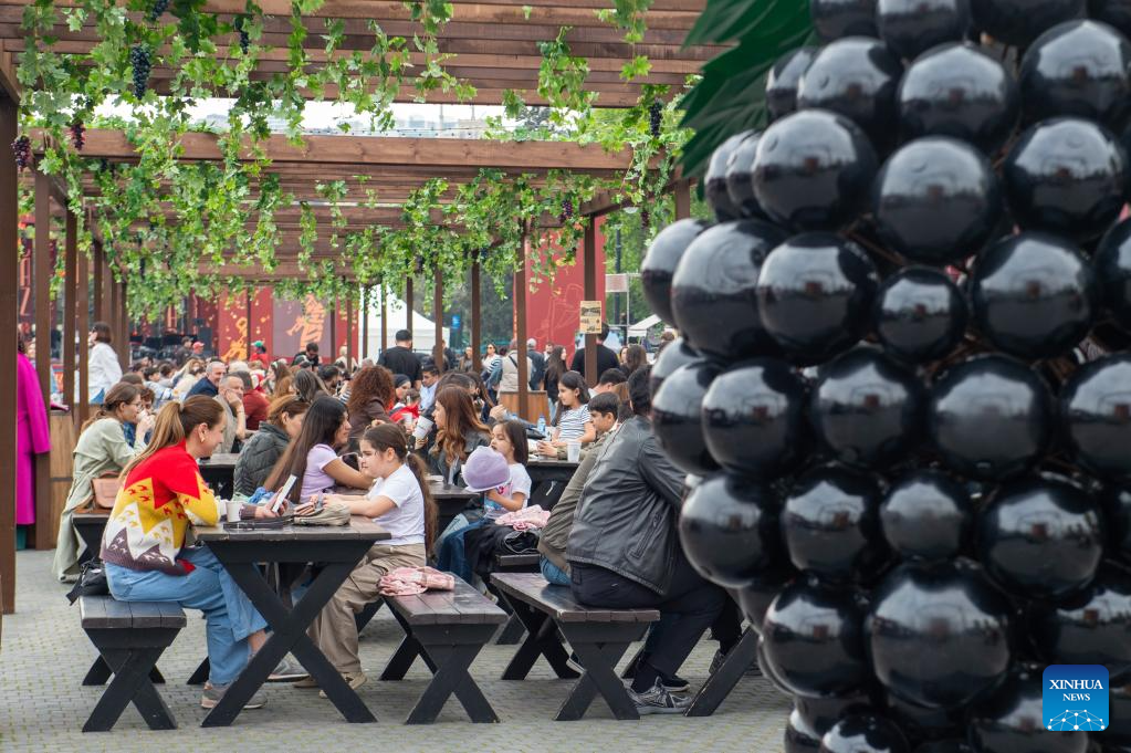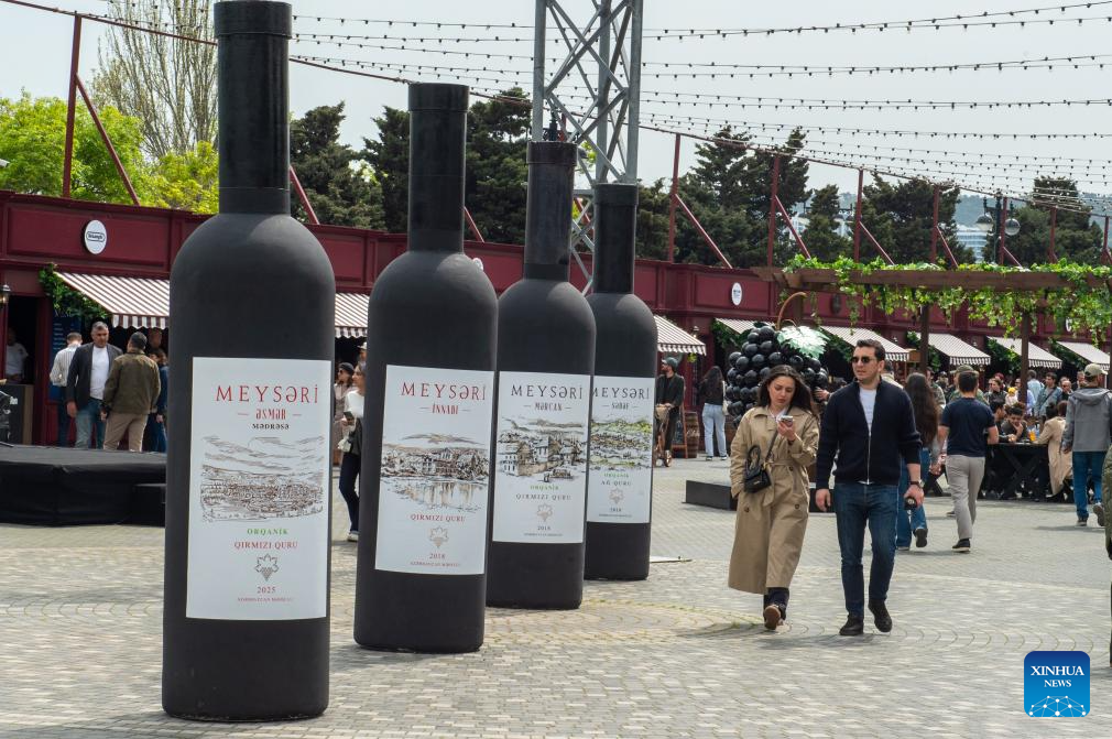 People attend the Jazz and Wine Festival at a seaside park in Baku, Azerbaijan, April 25, 2026. The ten-day event integrates Azerbaijan's indigenous wine-making traditions with musical art, bringing a relaxing and vibrant vibe to the city and drawing numerous locals and tourists for leisure and wine tasting. (Xinhua/Chen Junfeng)