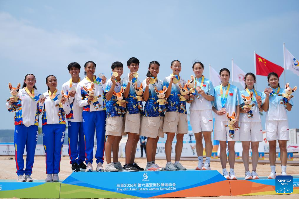 Gold medalist team Thailand (C), silver medalist team the Philippines (L) and bronze medalist team China pose for photos during the awarding ceremony of the women's 4x60m relay of beach athletics at the 6th Asian Beach Games in Sanya, south China's Hainan Province, April 26, 2026. (Xinhua/Pan Yulong)