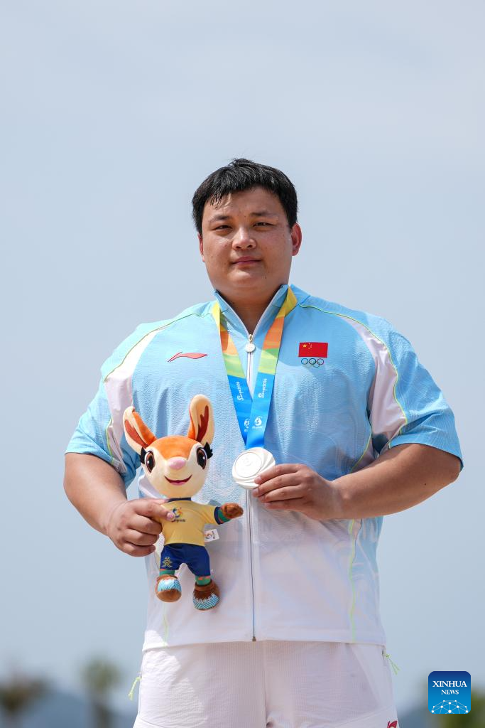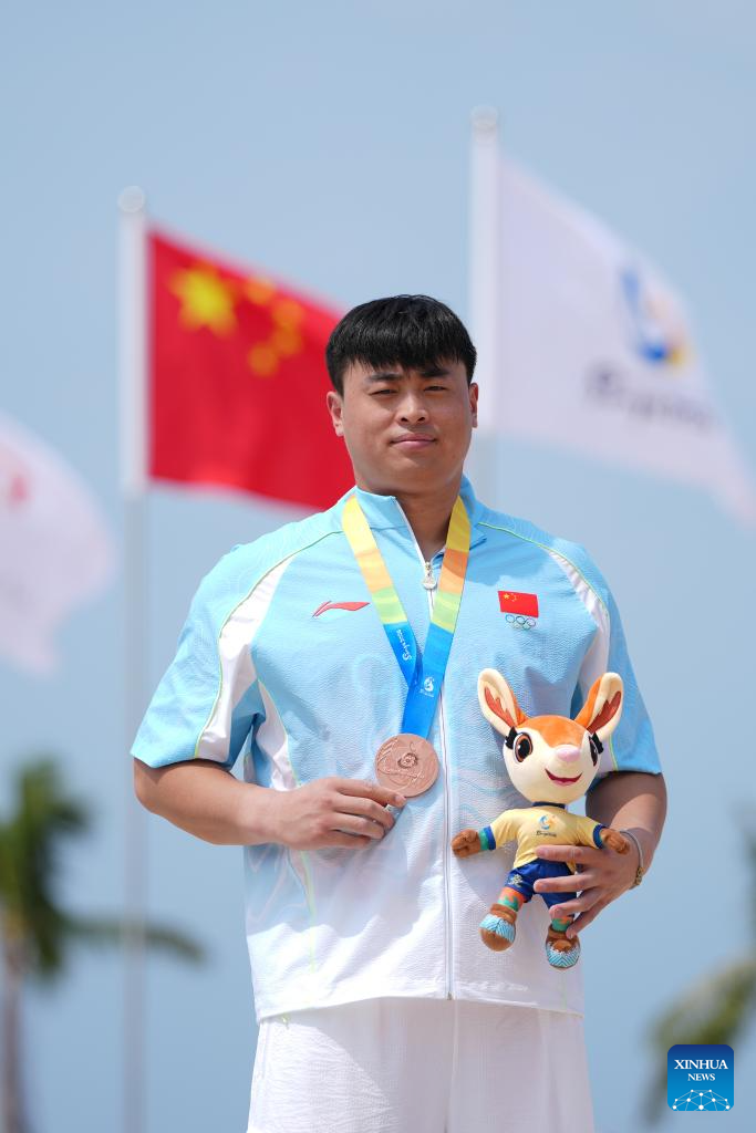 Silver medalist Chen chengyu of China poses for photos during the awarding ceremony of the men's shot put of beach athletics at the 6th Asian Beach Games in Sanya, south China's Hainan Province, April 26, 2026. (Xinhua/Pan Yulong)