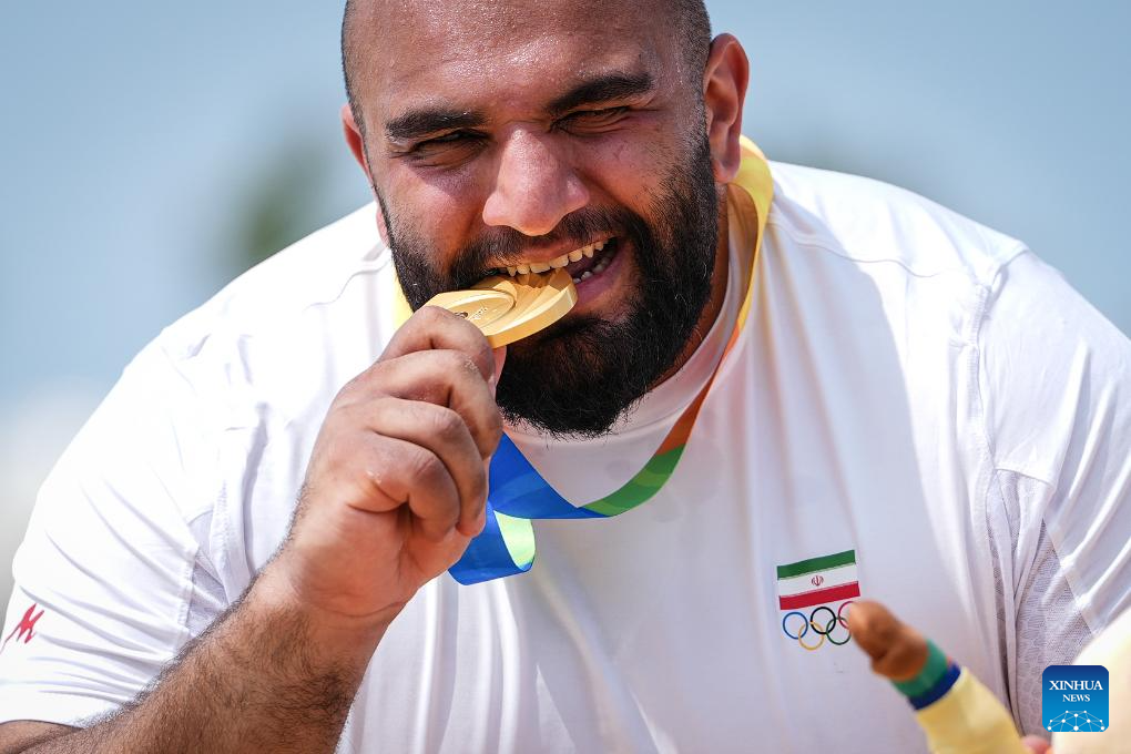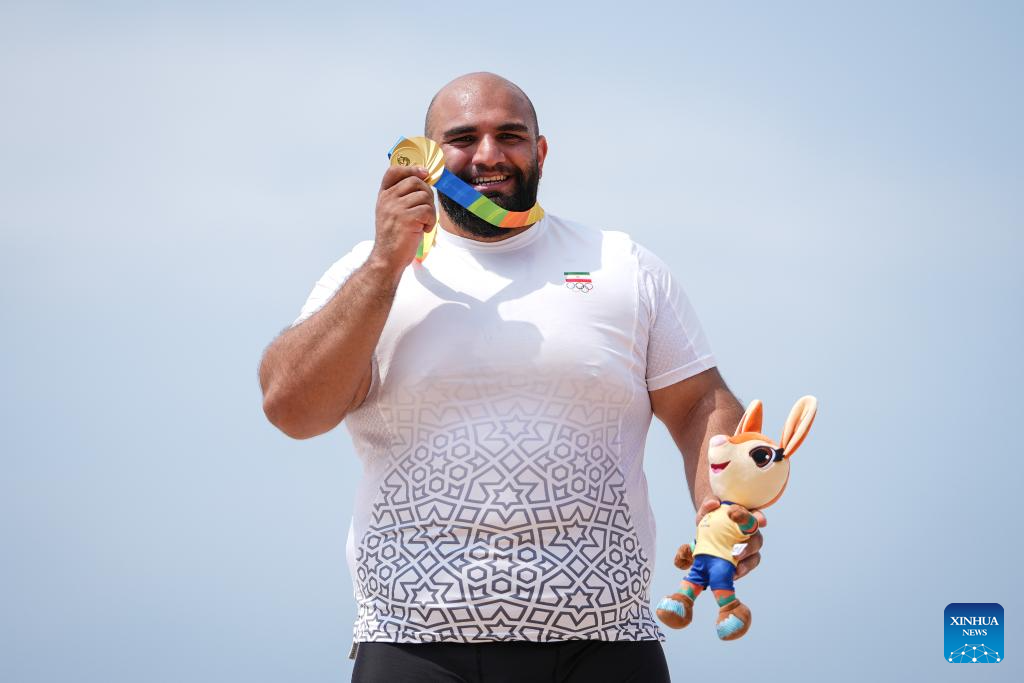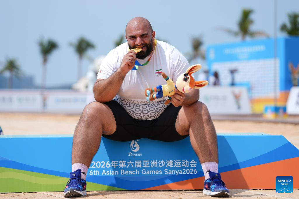 Gold medalist Hassan Ajamibakhtiarvand of Iran poses for photos during the awarding ceremony of the men's shot put of beach athletics at the 6th Asian Beach Games in Sanya, south China's Hainan Province, April 26, 2026. (Xinhua/Pan Yulong)
